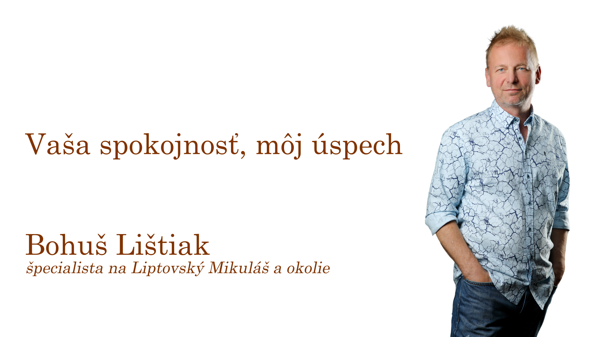 Volám sa Bohuš Lištiak a na realitnom trhu sa pohybujem už od roku 1995 - vtedy som realizoval svoj prvý realitný obchod. V roku 2004 som si musel vybrať - buď reality alebo práca profesionálneho hasiča v HaZZ Liptovský Mikuláš (rozhodol som sa pre hasičov) , kde som pacoval až do roku 2010. Krátko na to som sa vrátil späť do sveta realít , založil som si svoju vlastnú realitnú kanceláriu v ktorej pracujem aj v súčasnosti.